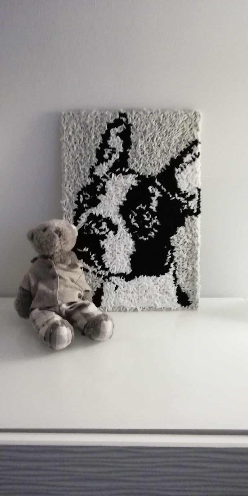 Lomalla paljon solmuja. Pojan huoneeseen makramee tunnelmavalaisin. Erilaisten solmujen lisäksi valaisimessa paljon mustia ja valkoisia helmiä. Sisällä roikkuvia metallilankoja, joissa 200 pientä mikro ledilamppua.